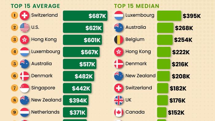 Switzerland once again leads globally, with average wealth per adult at $687,166. The United States follows closely at $620,654, while Hong Kong ranks third at $601,195.