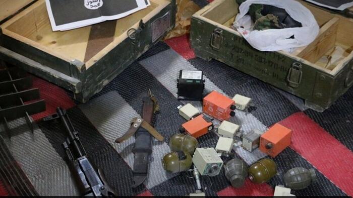 Photos from the raids published on the SANA website show printed papers showing the ISIS logo carefully placed on top of explosives and weapons allegedly seized in the raids, as well as action shots of security force members running in the street.