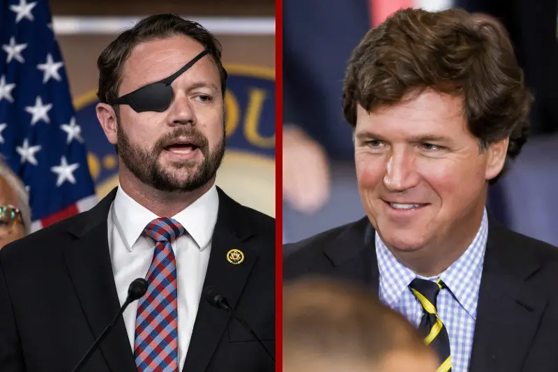 L| Rep. Dan Crenshaw (R-TX) speaks during a press conference on Capitol Hill on June 26, 2024 in Washington, DC. (Photo by Samuel Corum/Getty Images) R| Political commentator Tucker Carlson attends the inauguration ceremony of US President-elect Donald Trump in the US Capitol Rotunda in Washington, DC, on January 20, 2025. (Photo by SHAWN THEW/POOL/AFP via Getty Images)