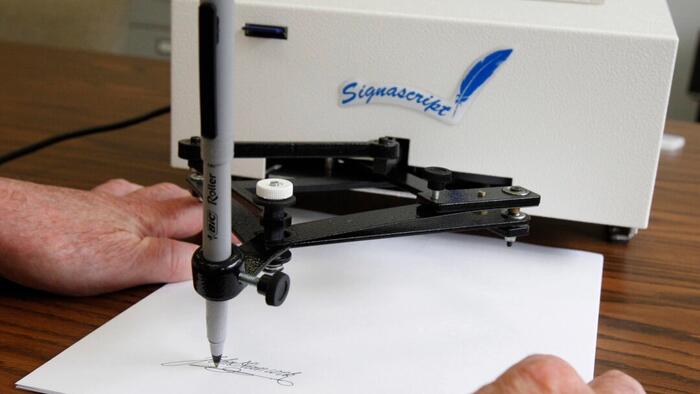 Damilic Corp. president Bob Olding anchors a sheet of paper as the Atlantic Plus, the Signascript tabletop model autopen, produces a signature at their Rockville, Md., office, June 13, 2011. Manuel Balce/AP