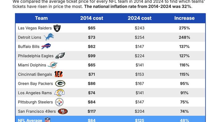 The steepest jump belongs to the Detroit Lions, whose average game-day cost ballooned from $92 in 2014 to $277 in 2024 — a 201% increase. Lions fans may not have had much to celebrate a decade ago, but with the team emerging as a Super Bowl contender, demand has driven prices to the top of the league.