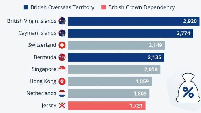 It is followed by Luxembourg (1,399) and then the Bahamas (1,283), the latter of which is an independent member of the British commonwealth but not an OT or CD. In position 12 comes the Isle of Man (1,189) and in 13 comes Guernsey (1,145), both Crown Dependencies. The United Kingdom places in 19th position with a value of 865.