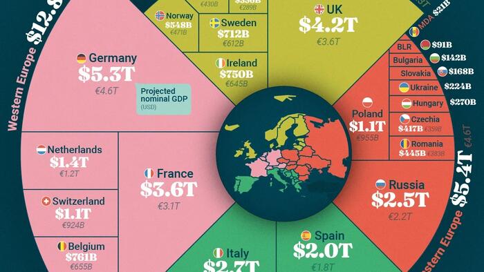Data for this visualization comes from the IMF’s World Economic Outlook database. It ranks every European country by projected nominal GDP in current U.S. dollars and euros.