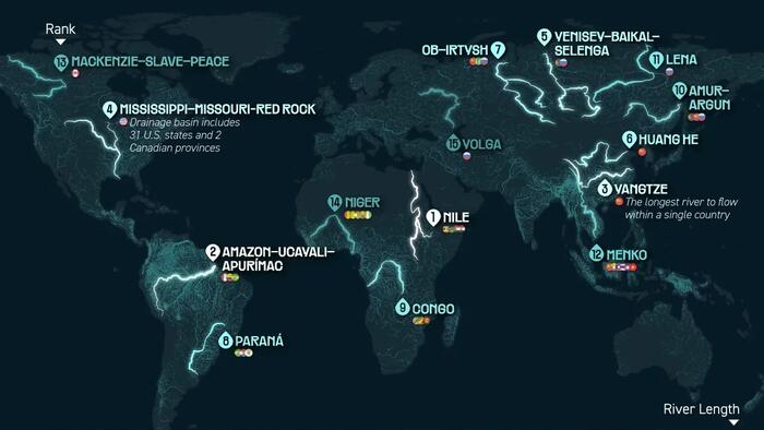 Five rivers in the top 15 run exclusively within one nation: China’s Yangtze and Huang He, the U.S.’ Mississippi, and Russia’s Lena and Volga.