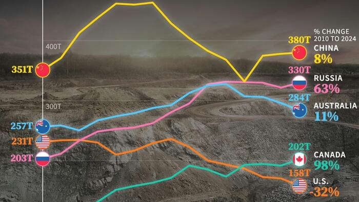 The U.S. is the only country in the top five to post a decline. In 2024, it produced 158 tonnes, down from 231 tonnes in 2010—a 32% drop. Environmental regulations, lower ore grades, and the closure of key mines have all contributed to this decline, pushing the U.S. to fifth place globally.