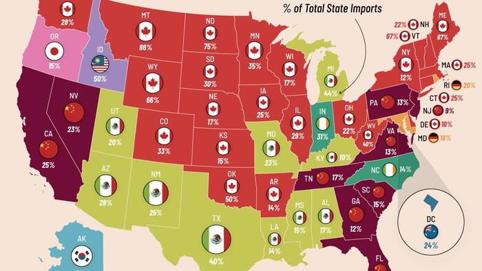 This map, via Visual Capitalist’s Bruno Venditti, illustrates the top import partner of every U.S. state as of November 2024.