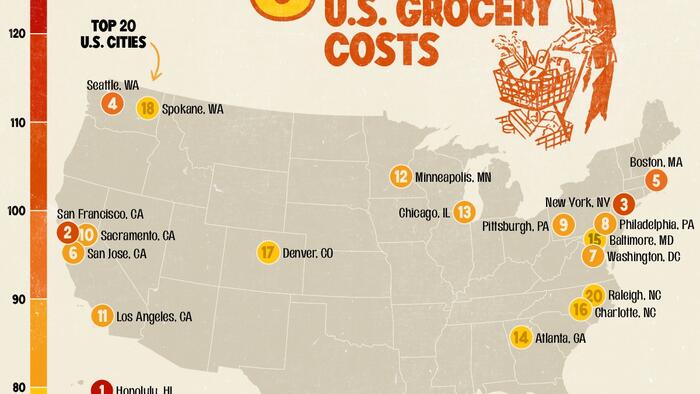 This visualization, via Visual Capitalist’s Dorothy Neufeld, ranks the top 20 American cities with the highest cost of groceries, based on data from Numbeo.