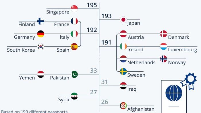 Japan comes in second place, with its citizens able to visit 193 countries, followed by Finland, France, Germany, Italy, South Korea and Spain in joint third, with access to 192 countries.