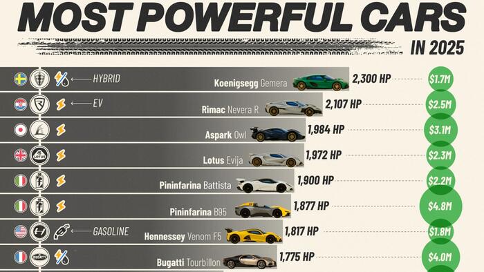 In this infographic, Visual Capitalist’s Marcus Lu ranks the 20 most powerful cars of 2025, spanning gasoline, hybrid, and fully electric powertrains.
