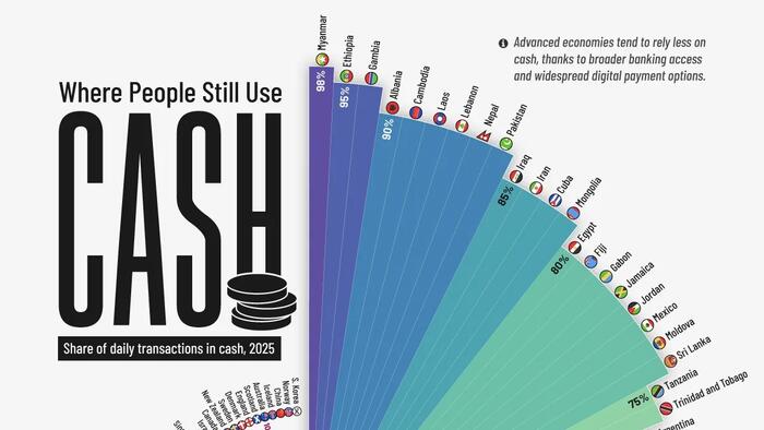 This infographic, via Visual Capitalist’s Pallavi Rao, ranks 123 countries by the share of daily transactions completed with physical banknotes and coins, spotlighting where cash is still king, and where itโs becoming a relic.