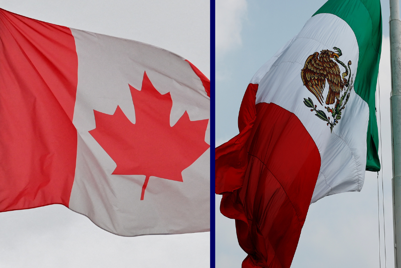 (L) A Canadian flag flutters in the wind (Photo by MATTHIEU DELATY/Hans Lucas/AFP via Getty Images) / (R) A Mexico flag flies in the Paddock. (Photo by Chris Graythen/Getty Images)