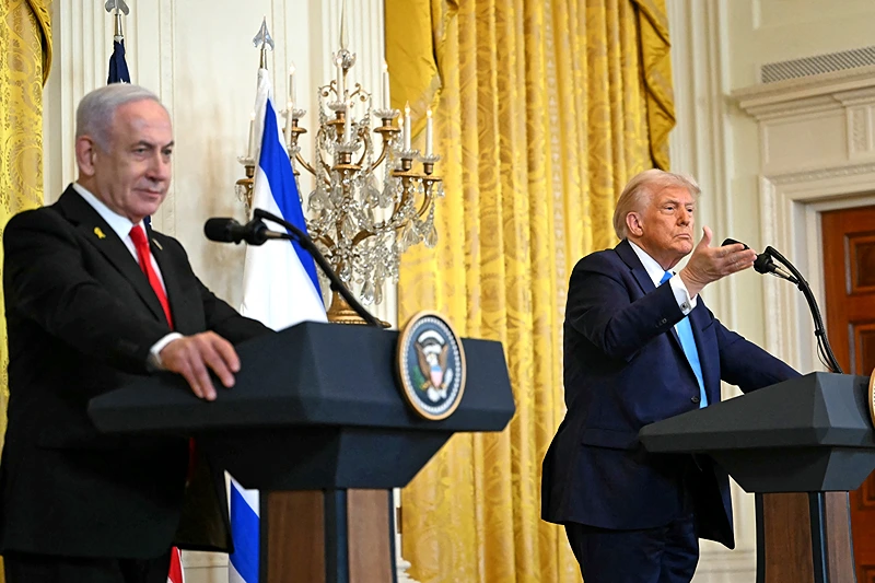 US President Donald Trump (R) and Israel’s Prime Minister Benjamin Netanyahu take questions during a press conference in the East Room of the White House in Washington, DC, on February 4, 2025. (Photo by ANDREW CABALLERO-REYNOLDS/AFP via Getty Images)