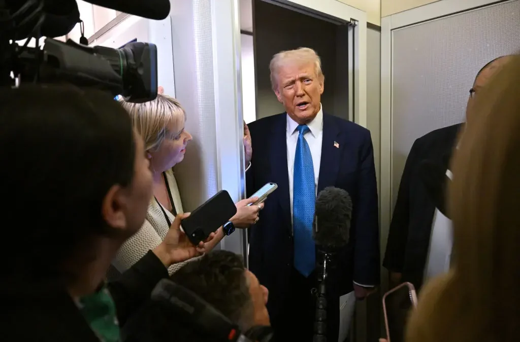 US President Donald Trump speaks with journalist on board Air Force One on route from Miami, Florida, to the White House in Washington, DC on February 19, 2025. (Photo by ROBERTO SCHMIDT/AFP via Getty Images)