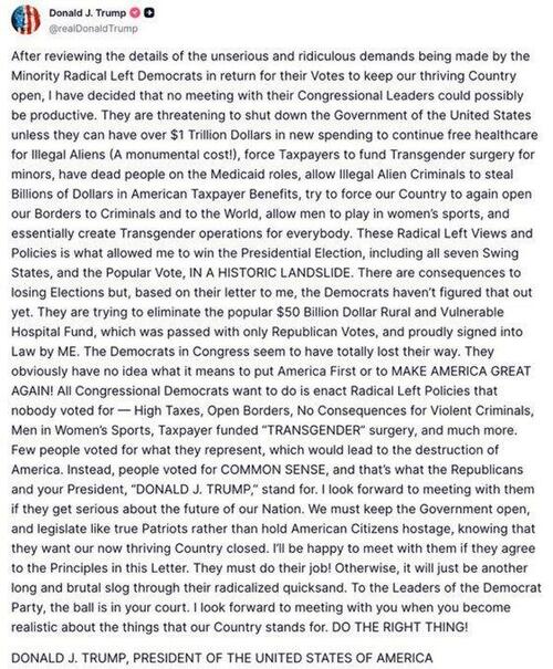 “They are threatening to shut down the Government of the United States unless they can have over $1 Trillion Dollars in new spending to continue free healthcare for Illegal Aliens (A monumental cost!), force Taxpayers to fund Transgender surgery for minors, have dead people on the Medicaid roles, allow Illegal Alien Criminals to steal Billions of Dollars in American Taxpayer Benefits, try to force our Country to again open our Borders to Criminals and to the World, allow men to play in women’s sports, and essentially create Transgender operations for everybody.”
