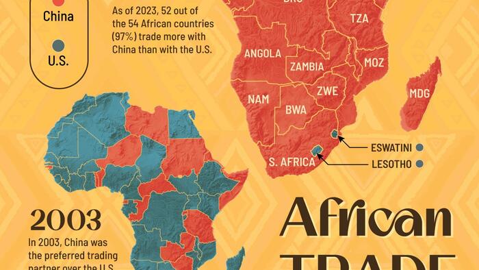 This graphic, via Visual Capitalist’s Kayla Zhu, visualizes whether each African country trades with the U.S. or China more in 2003 versus 2023.