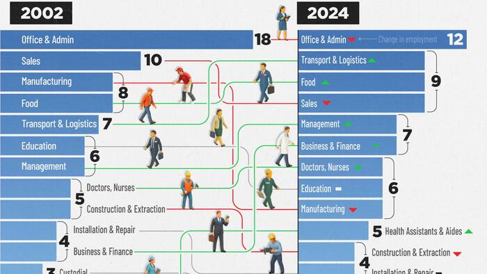 The visualization, via Visual Capitalist’s Pallavi Rao, compares how 100 hypothetical workers were distributed across occupations in 2002 versus 2024. It revealing which fields lost—or gained—share during a period marked by globalization, new technology, and a pandemic.