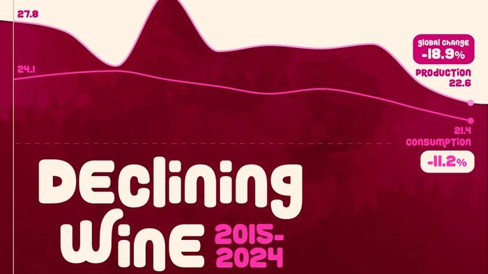 While production has fallen sharply, global wine consumption has declined at a slower pace. Total consumption dropped from about 24.1 billion liters in 2015 to 21.4 billion liters in 2024, a decline of roughly 11%.