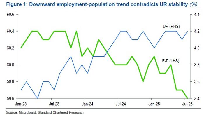 In conclusion, Standard Chartered estimates that actual monthly job creation among newly opened firms is no higher than 20k or so. So the published monthly NFP data have probably continued to overstate job growth. By this reckoning, a 100k published NFP growth number on 5 September would suggest an actual number closer to 30k; by the same calculation, even a 170k published NFP number would be only 100k (roughly equal to the estimate of equilibrium NFP growth) in reality.
