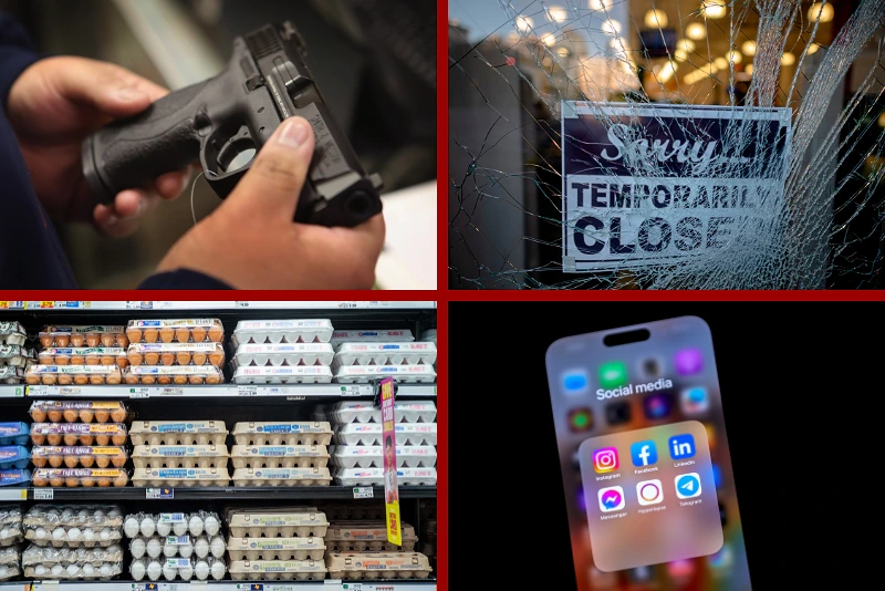 (L-Top) A customer shops for a pistol at Freddie Bear Sports sporting goods store in Tinley Park, Illinois. (Photo by Scott Olson/Getty Images) / (L-Bottom) Cartons of eggs are seen for sale. (Photo by Brandon Bell/Getty Images) / (R-Top) A sign reading “sorry temporarily closed” is seen behind a shattered glass of a storefront. (Photo by JOHANNES EISELE/AFP via Getty Images) / (R-Bottom) the logos of social media applications. (Photo Illustration by Buda Mendes/Getty Images)