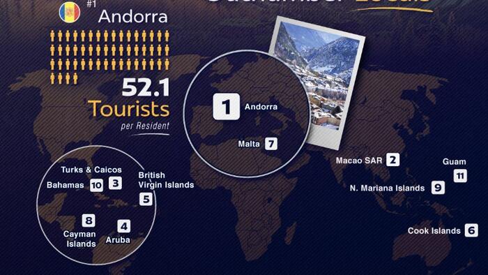 Andorra tops the list with more than 52 tourists per resident each year, followed by Macao at 24. These microstates have limited populations but high visitor appeal, from Andorra’s ski resorts to Macao’s casinos.